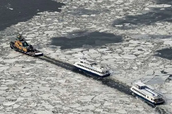 عبور کشتی مسافربری از میان آبهای یخزده نیویورک