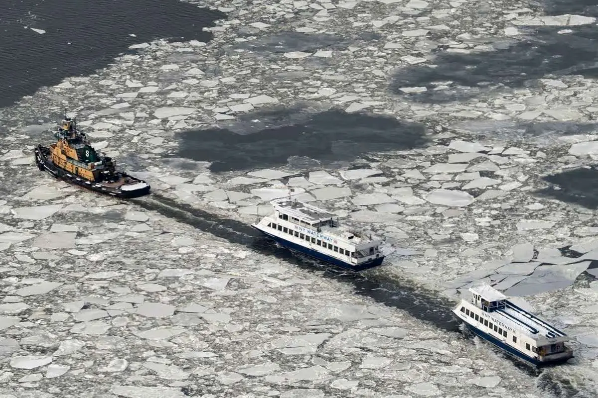 تصاویر هوایی نشان میدهد یک کشتی مسافربری در نیویورک در حال عبور از میان آبهای یخزده است و با شکافتن لایههای یخ، مسیر خود را پیش میبرد.